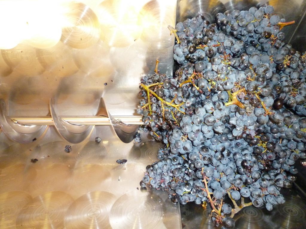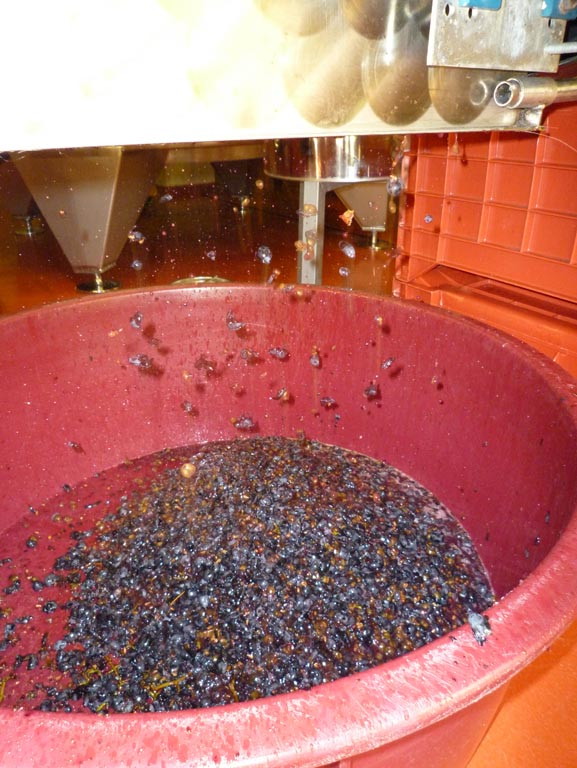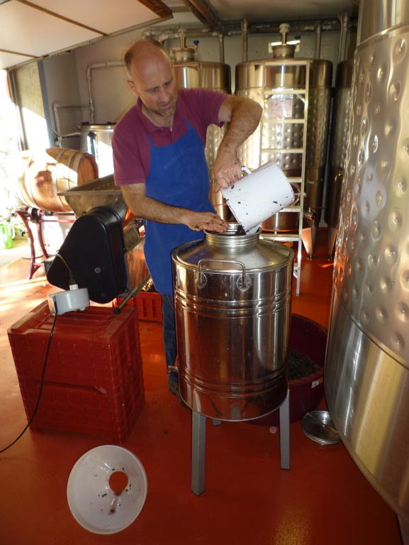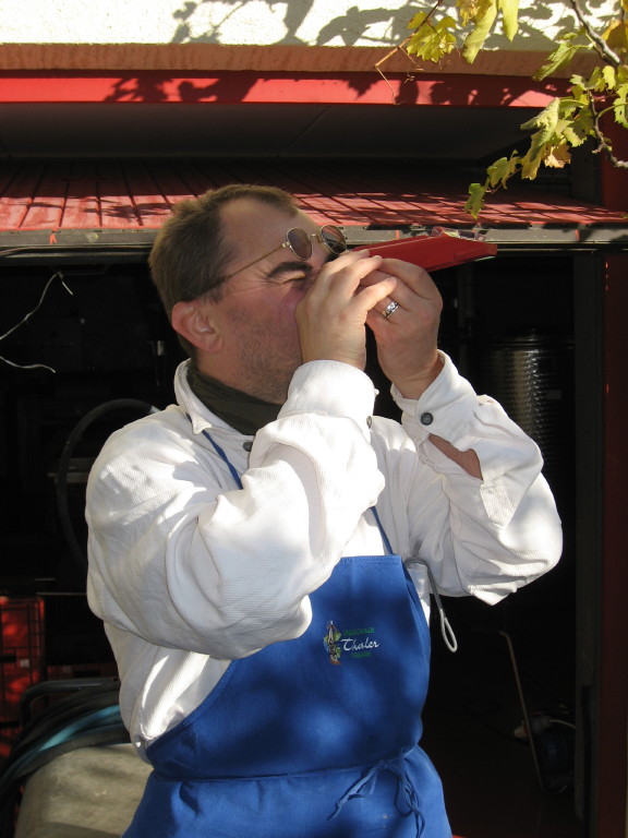 Die Rebblätter waren schon am Fallen, die mehrmaligen Morgenfröste haben die Beerenhäute mürbe gemacht, der Botrytispilz war im Kommen, es war also Zeit. Die Anwesenheit von den in Wien lebenden Freunden Judith und Armin, denen ich größtenteils die schönen Bilder verdanke, war ein Grund mehr, die Lesesaison endgültig abzuschließen. Bei der Gelegenheit konnte ich auch meine kleine Abbeermaschine, mit der ’93 alles begann, reaktivieren. Die Ausbeute: ca. 70 kg Trauben mit 22 °KMW.